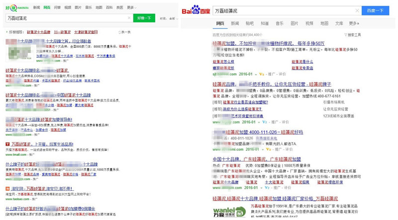 最后一點,若想挑選可靠的硅藻泥品牌,可以通過搜索引擎搜索該硅藻泥品牌,一個看其官網的效果是否像大品牌,另一個可以看搜索引擎在官網前擺放的推廣鏈接數(shù)量,畢竟品牌一出名,想模仿者就多了。像搜萬磊硅藻泥,百度和360搜索的結果第一頁就有好幾個想沾萬磊硅藻泥光的硅藻泥牌子。大家在搜索萬磊硅藻泥的時候也要多家甄別。