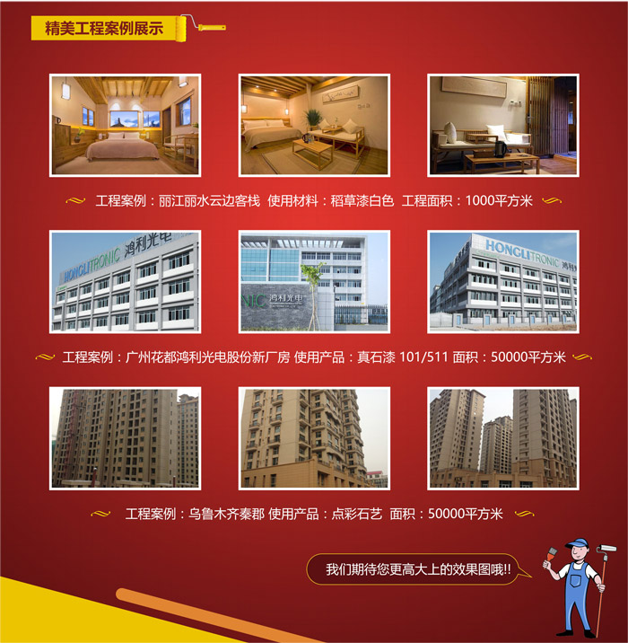 圖片要求:主體工程施工前后的全過程效果圖片(有顯示萬磊公司LOGO的材料和包裝為佳),每個(gè)工程精選3-5張,圖片清晰,主體建筑無遮擋,效果高檔大氣。請(qǐng)將您的工程案例圖片發(fā)送至我公司推廣部郵箱: wanleituliao@foxmail.com,同時(shí)注明客戶所在區(qū)域及公司(客戶)名稱、工程項(xiàng)目名稱,使用材料及施工面積。我們將在收到圖片后對(duì)照片進(jìn)行一一篩選,并將以郵件形式回復(fù)您,在我公司網(wǎng)站上公布獲獎(jiǎng)?wù)呙麊尾㈦娫捀嬷?br />   萬磊的發(fā)展離不開您的支持,歡迎廣大客戶踴躍參加,如有疑問可咨詢指定區(qū)域經(jīng)理。